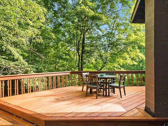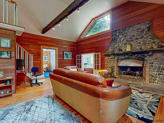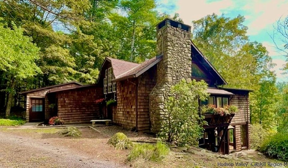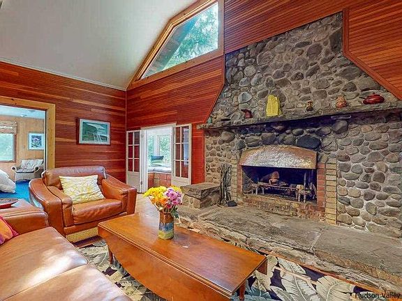 True Old Woodstock! This lovely, rambling natural wood home has the feeling of the original Maverick Art Colony or, Byrdcliffe cottage-homes with a touch of Adirondack style replete with a northlight painters window. Found on a private lane, Woodstockers call this a few "country blocks" from town house. Upon entering, step into a two story great room anchored by a bold, fieldstone fireplace. A large loft overlooks this room and the fireplace as well as the treetops outside the desk window at the back of the loft. Here might be the perfect spot to work or use as a creative and meditative space. Three bedrooms, one with it's own entrance and adjacent to the private oversized deck, and a fourth bedroom, library or office with entrance are on this level. This spacious room with its skylights and separate entrance is of flexibility. Yes, Woodstocky, or like the farm homes of yore, the kitchen with it's own fireplace as well as a substantial working space is on the first and lower level of the home. Take the stairway down from the great room to the kitchen, a cozy small fireplace awaits you in the corner and is super for atmosphere during the winter season. From here step into another expansive room that overlooks the lawns from two walls of windows. The multiple windows give balance to the cozy warmth of the wood walls - this room is delightfully peaceful as it is well integrated into the landscape. A pantry, full bath and laundry/mechanical room are off the kitchen.