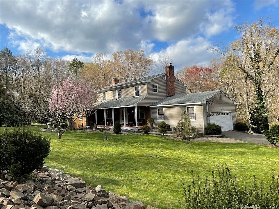 Traditional Colonial with unique "Fun Flair" features overlooking running brook, private woods on a quiet cul de sac. This Nature Lover's Delight offers Main level with updated kitchen with granite, oversized center island for entertaining, doors to Three Season enclosed porch off back with private serene setting all year long. Huge Formal living room with FPL and Den/Study just beyond and formal dining, too. (FYI currently seller uses LR as Formal DR - see photos). Upper level enjoys MBR with private bath and walk-in closet and 3 additional BR. Man/Woman Cave in lower level with full bath and walk out to party size patio. Laundry in LL. Newer front porch with plenty of room to sit and enjoy. Newer vinyl siding and windows, HW floors, Newer carpeting, CA on upper level. Generator and transfer switch remain. . 2 car garage and parking plenty. Great location near shops, dining, highway and several town centers. Yale and New Haven just minutes away. Come live, love, laugh and play in your forever home.