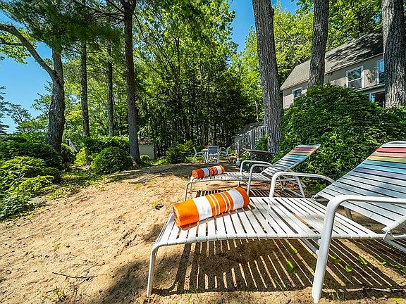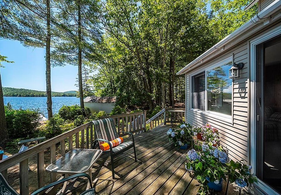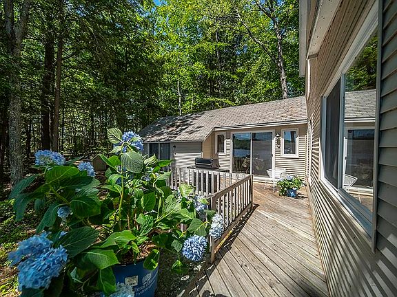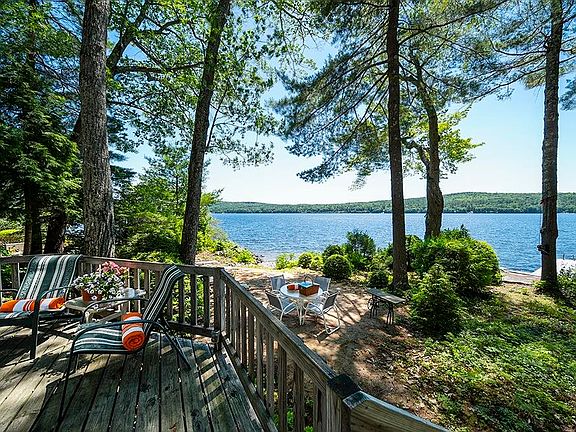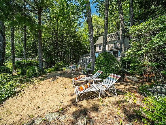 Meredith NH - This tranquil setting is near the end of a peninsula with southwest exposure and beautiful southwest breezes. All day sun, but plenty of natural shade is yours on this wooded lot with natural landscaping. 2 sandy beaches flank each side of this primarily level lot. Lake Waukewan is a Class A lake adored by water-skiers, swimmers, nature enthusiasts, and those seeking the quieter side of Meredith. You'll love the sounds of the birds and crickets in the evening creating the peaceful feeling of being remote. It is almost impossible to find a property that has all this and is just 5 minutes by car to Meredith amenities. The Meredith Town Docks on Winnipesaukee, Meredith's BarnZ's Cinema, Hannaford's supermarket, and Church Landing Inn are approximately 6 minutes away by car. The house has a first floor bedroom with sliders to a deck. Pine flooring under the carpet in the living/dining area, a real field stone fireplace, and natural wood work add to the charm of this rare property. The laundry, pantry, eat-in kitchen, a foyer and a mudroom are on the first level. The living room has sliders to the deck and windows on 3 sides. 2 bedrooms and a renovated bathroom with a bead board ceiling are on the upper level.