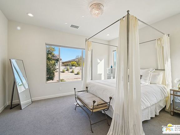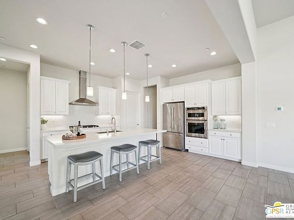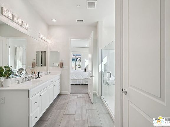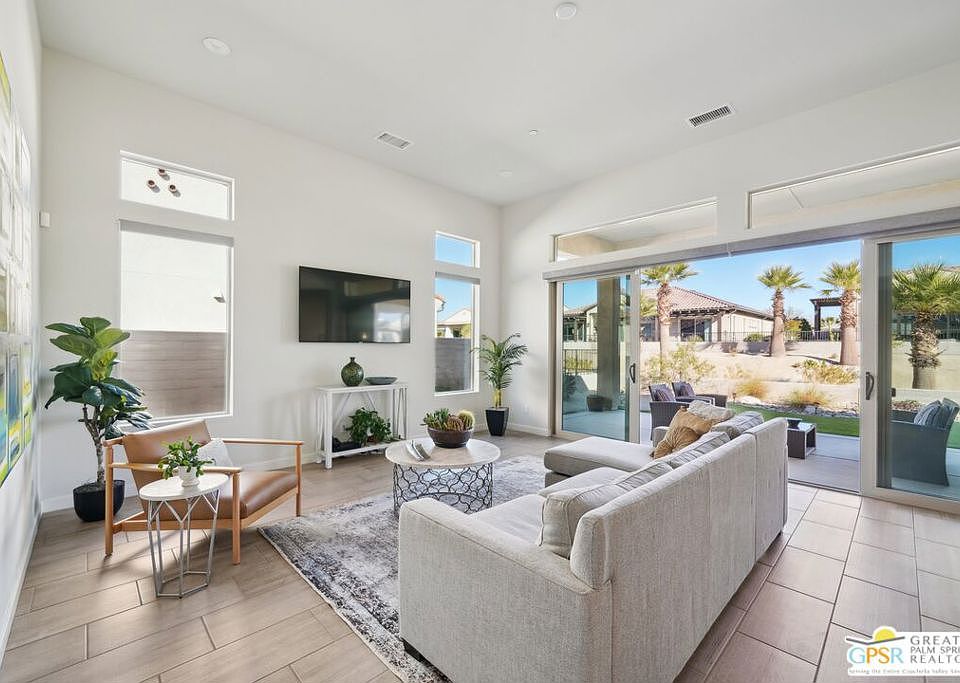 Experience the allure of the sought-after PHASE 1, PLAN 8 Spanish SERENITY model in the prestigious 55+ Del Webb Rancho Mirage enclave. This light-filled residence is thoughtfully designed with three spacious bedrooms, a versatile den/media room, and two beautifully appointed bathrooms. The layout features a secluded guest bedroom wing and a luxurious primary suite on opposite sides of the home. Stunning porcelain tile floors seamlessly flow through the main living areas, while plush carpeting adds warmth to the bedrooms. The open-concept design boasts soaring ceilings, energy-efficient LED lighting, and walls of windows that invite natural light into the great room with upgraded center sliding doors. At the heart of the home, the chef's kitchen is a masterpiece, showcasing gleaming white quartz countertops, upgraded 42" wrap-around cabinetry with crown moulding, a central island illuminated by designer pendant lights, stainless steel appliances, soft-close drawers, and an oversized walk-in pantry. The adjacent formal dining area is nestled in its own niche, offering the perfect space to entertain friends and family. The primary suite is a retreat in itself, complete with a spa-inspired ensuite bathroom featuring a dual-sink vanity, an expansive rimless glass shower, linen closet, and a walk-in closet designed for organization. Upgraded expanded laundry/hobby room with a sink, corner window, and ample cabinet and counter space. Step outside to your private havena serene, low-maintenance yard with artificial turf, a covered patio, and open walls that offer peaceful views of the surrounding walking path. This home is equipped with a leased Tesla SOLAR system ($109 mo) and provides access to an array of world-class resort-style amenities, including tennis, pickleball, bocce ball, a state-of-the-art fitness center, sparkling pools, a clubhouse, bar/lounge, billiards, a putting green, and more!. This is more than a home it's a lifestyle.