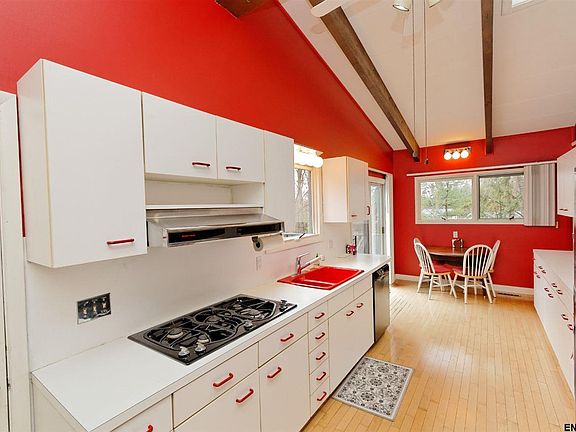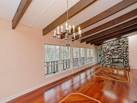 Unique and seculded LARGE ranch style home with finished lower level walkout. A flexible layout with 4BR's 2.5 baths (potential to have a 5th), a 2 car garage and 2 fireplaces. First floor has vaulted ceilings and a modern open din RM/ Liv Rm setup w/ tons of windows and access to a massive deck! Other features include an in ground pool and custom Hardwood flooring (w/ in lay). A one of a kind home that makes you feel like your in the ADKs in the heart of North Colonie!
