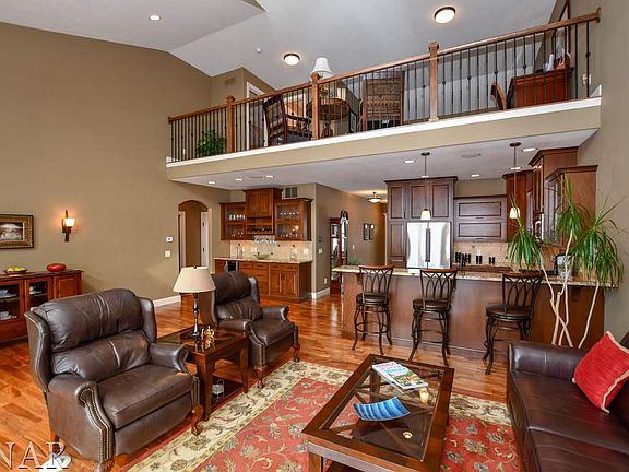 LIFE ON EASY STREET is grand in this amazingly luxurious home. Enjoy all your extra time from yard maintenance and snow removal obligations and savor picturesque views of the meticulously maintained golf course by sitting on your deck or entertaining your friends. Custom kitchen with GE Cafe series appliances and granite. Entire 1st floor has Brazilian cherry hard wood floors or tile. Nuvo Grand Concerto distributed audio system sets the perfect mood for whatever the occasion or routine. Retreat to the master suite which has a two person custom shower, Enjoy endless hot showers with a tankless water heater, double marble vanities, and custom designed closet system. The space goes on with another family room in the lower level, 3 storage areas, huge bedroom same size as the master, walk in closet, full bath, wet-bar and game area. 2nd floor has another bedroom, walk in closet, ensuite bath and a loft that overlooks the great room. Zoned HVAC. The BEST one in Prairie Vista.