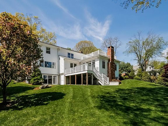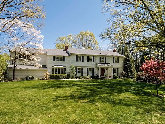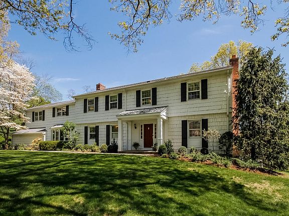 Picture perfect, this 6-Bedroom brick and shingle colonial sits prominently on 2 lush acres on this quiet, mid-country cul-de-sac.....lovingly maintained and richly enhanced through the years with tasteful updates and quality finishes, this property offers a beautiful setting and 3-levels of amazing living space....Fabulous great room/fp off the kitchen opens to both a stone terrace and a sunny deck overlooking the park-like gardens harmoniously blending the indoor and outdoor space..lower level offers many options with a walk-out entrance,playroom/fp, art studio, bath and storage....mudroom to kitchen and backstairs, rich hardwood floors, 4 fireplaces, gracious public rooms, den/fp, family rm, great rm, eat-in kitchen, Master plus 5 br. and sitting rm....pristine and perfectly presented