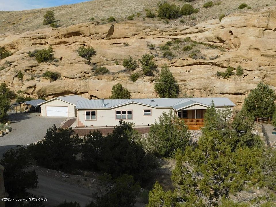 Looking for the private secluded location, this home is located in a private canyon. A roomy home with 4 BR, 2.5 BA, 2 Car Garage and a 2 Car Carport. Detached 2 car garage is heated and cooled. Inside the open layout is great with two living spaces. Home has been completely stuccoed and offers a covered front deck with a view of the mountains! In back there is a pergola.