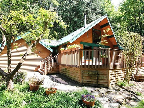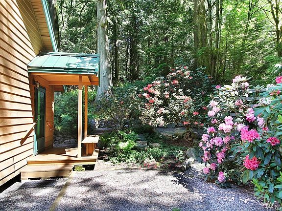 Beautiful property featuring pathways, creek w/ bridges, forest, fire pit & shed across three Sudden Valley lots! Main level living w/ tons of equity potential. Stunning vaulted ceilings, wood burning fireplace, huge composite deck, 50-yr metal roof, heat pump. 3/4 bath, laundry & office in detached 2-car garage. One-of-a-kind design w/ remarkable outdoor space. Includes access to two outdoor pools, gym, parks, trails, beaches, dog parks, tennis & basketball courts, library & more!