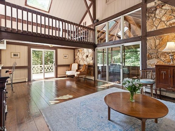 Present all offers! Introducing 18 Round Hill, a custom timber-frame gem located in the community of Round Hill Manor just 30 miles from Midtown Manhattan. This upscale rustic retreat features 4 bds/2.5 bths, flowing floor plan (perfect for entertaining), spacious first floor primary suite, great room with cathedral ceilings & walls of glass and quarry cut stone, gleaming wide plank wood floors throughout first and second levels, family room with large fireplace/wood burning stove, serene three season porch with mahogany floors leading to an expansive wrap around deck, walk out partially finished basement/laundry with new appliances, two car garage, enough parking for multiple cars/camper, central air, public utilities (a rarity in Kinnelon), private 1 acre with level back yard & shed, blue ribbon schools and LOW TAXES. In addition, Kinnelon has the distinction of being the second safest town in NJ. This is the best deal in desirable Round Hill Manor and a must see for the discriminating buyer! Updated & county certified septic system!