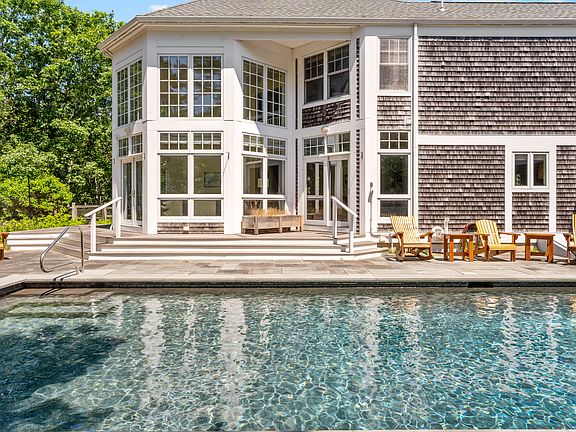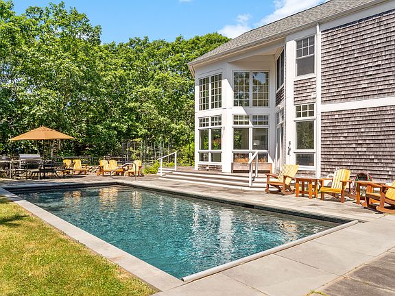 DEEP BOTTOM POND: 5-bedroom custom home with heated Pebbletec pool and exclusive association access to Tisbury Great Pond. This spacious layout features two primary suites, two guest rooms, and a third private guest suite. Perfect for entertaining, the open floor plan centers around the kitchen, dining, and living areas. The dramatic living room has cathedral ceilings, floor-to-ceiling windows, a fireplace, and opens to a mahogany deck. The kitchen includes Viking appliances, granite countertops, double ovens, and a pantry with a second fridge and new washer/dryer. A den sits just off the kitchen. The first-floor primary suite has its own bath and access to the deck, while upstairs, a second large suite with private bath is at the top of the stairs. Two guest rooms share a hall bath, and a large third guest suite features a living room, bedroom, fireplace, and bath. Recent upgrades include a new water heater, new furnace, refurbished AC, new generator, and more. Sited on 1.47 acres, with landscaped gardens, delightful pool patio area, and a heated garage. Deeded water access, tennis courts, and walking trails. 15 minutes to downtown Edgartown.