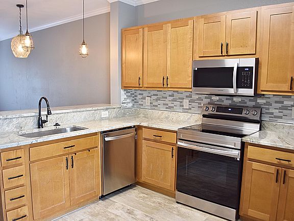 LOCATION LOCATION LOCATION. It doesn't get any better than this in the development. Located in the front backing to the pool, not another building! Beautifully remodeled 2 bedroom 2 and 1/2 bath townhouse in the Verandas at Freeport. Featuring open Kitchen, dining and living with 1,143 of living space. The newly updated kitchen features new Quartzite counter tops, with ample storage and counterspace. New ceiling fans, all new plumbing fixtures to include a commercial faucet with ppot filler in kitchen. New vanity in half bath for extra storage and new EVP flooring in living, stairs, landing and bedrooms. All new neutral tone paint makes this unit move-in ready and better than new! New tile floors in the kitchen, and bathrooms, and laundry. New tile showers, new bathroom vanities with Carrera Marble tops, new bronze light fixtures, new plumbing fixtures and cabinet and door hardware. New HVAC. New Stainless appliances. Washer and Dryer included. New Blinds throughout. This unit has been updated with higher quality workmanship & materials, than a new unit. Gorgeous Sunset views from the covered back porch.