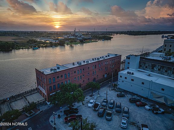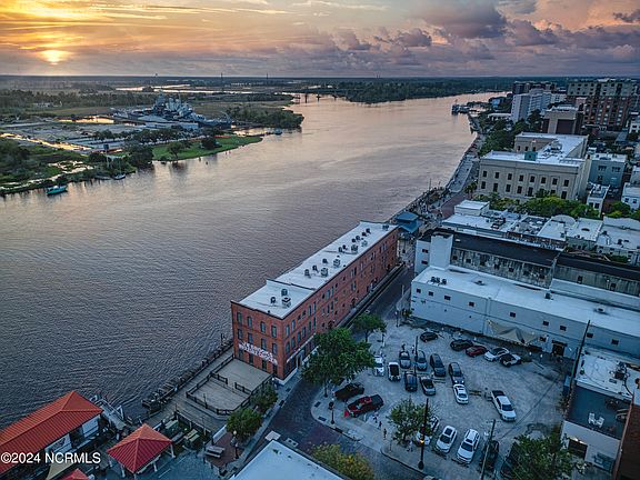 You can't get more waterfront than this stunning condominium, located in the iconic JW Brooks Building on Wilmington's historic Riverwalk. The HOA just approved short-term rentals in the building, making it a hot investment opportunity. From the large windows set into the exposed brick walls, you'll see the Cape Fear River sparkling below, and when you step out onto the wrought iron balcony, you'll enjoy a panoramic view of the river itself, the Cape Fear Memorial Bridge, and the battleship. (Note that the HOA maintains a private dock for the use of residents and their guests.) The front room is a showpiece, with an open floor plan that's perfect for entertaining. The ceiling is lined with reclaimed wood, and there's a contemporary wood feature wall that extends along the staircase leading to the second floor, juxtaposing the old and the new. There are 3 bedrooms and 2 1/2 bathrooms, with the primary bathroom having been recently updated in spectacular fashion, including a soaking tub that looks directly onto the river. You'll have to see the sunsets from this beautiful home to believe them!
