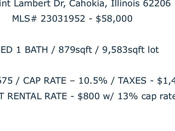 SOLD SEPERATE OR AS PART OF A PACKAGE. Opportunity abounds for the savvy investor looking to start or add to their portfolio in the Mid-West Real Estate Market. Affordability with a solid cap-rate make this single residential home minutes from Downtown St. Louis an attractive buy. This is a 3 bed 1 bath ranch that is tenant occupied. Rent is below market rate. There are six 3bed 1bath & three 4bed 1bath Ranches that can be bought individually or as a package deal. All of the appraisals from a year ago are available, all but 1 is occupied, & are priced to sell. ALL 9 PROPERTIES CAN BE FOUND IN THE FOLLOWING MULTI-FAMILY LISTING UNDER THE ADDRESS 745 SAINT NICHOLAS, CAHOKIA IL 62206 - MLS#23032483 & here they are individually:MLS#23031952 -18 Saint Lambert, MLS#23031941 -502 Saint Barbara Ln, MLS#23031927 -711 Saint Paul Dr, MLS#23031918 -1312 Richard Dr, MLS#23031911 -1220 Richard Dr, MLS#23031901 -1166 Camp Jackson Rd, MLS#23031891 -1166 George St, MLS#23031885 -122 Saint Barbara Lane.