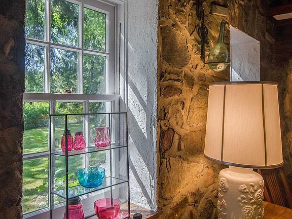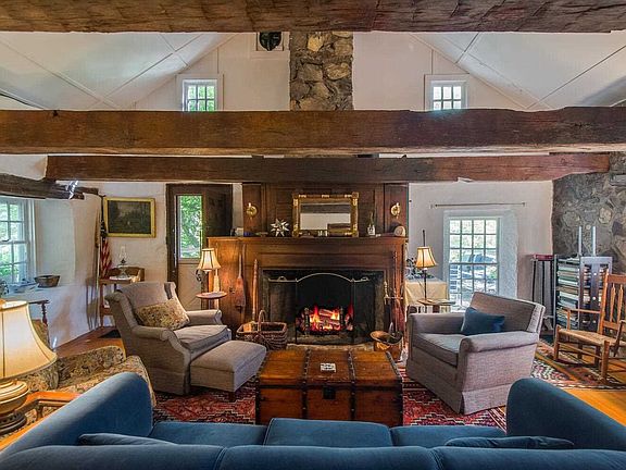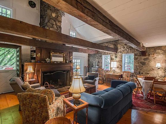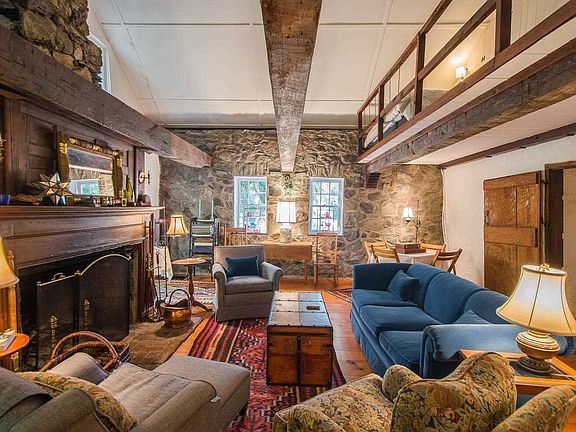According to local lore, this rare stone caretaker's cottage was part of a large dairy farm built with stone cement construction and beams, suggesting it could date back to the 1700's. The now adjoining two-car garage with cow bars in its windows was where the cows were kept. One of the two original cow bells used to call the cows back from the watering hole remains on the wall outside the garage. The living room, which is the original part of the house, has wide planked floors and the working cook-in fireplace remains. The ceilings are vaulted with view of the loft which was used as the hayloft. From the living room, outdoor living is enriched with a beautiful Epay wood deck. The wide plank floors continue in the dining room, also with a fireplace, and the family room, which is draped in rich wood paneling. A hard-working galley kitchen with gas range leads to a light-filled mud room. The two full baths are updated with all white tile and glass shower enclosures. The second floor has a very spacious bedroom, a sleeping loft, and conveniently located washer and dryer. Sited privately on 4.3 acres the land is level or gently sloping offering plenty of space for a pool. Conveniently located to the Taconic State Parkway, minutes to golf, tennis, restaurants, and grocery stores. 70 miles to NYC, 12 minutes to New Hamburg Train Station.