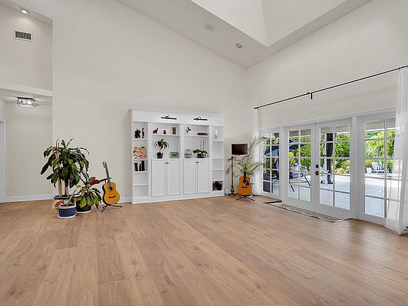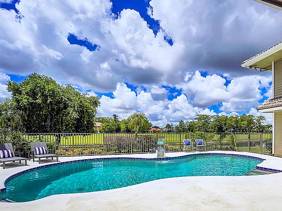 Space for days! Soaring ceilings in this enormous, sunny, bright waterfront 6-bedroom/3.5-bath, pool home in the coveted Marlwood Estates in PGA. This rare find will accommodate large & extended families with room to spare. Beautiful first floor primary bedroom suite on one side of the home & a separate wing on the opposite, housing 5 additional bedrooms; one with potential for a studio apt. The open-concept floor plan has wide-plank flooring, a vaulted ceiling with skylights, & French doors leading to a covered lanai & saltwater pool with waterfall & serene waterfront & golf course views. Massive spa-like pool area for entertaining, already plumbed for a summer kitchen! Airy Formal & Family rooms, Dining Room, & massive open granite kitchen with water views. Tons of counter & storage. Bright breakfast nook has modern lighting, skylight, and a backyard view. 1st floor primary bedroom has his and hers walk-in closets with built-ins, and private entry to the pool through French doors. The atrium-like primary bath has his and hers vanities with marble countertops, a separate water closet, a separate glass-enclosed shower, and a sunken tub. All 5 additional bedrooms have hardwood floors & both 2nd-floor bedrooms have charming seated bay windows and beautiful views. Large mud room has two entrances, from garage & exterior, with large capacity HE LG washer/dryer, utility sink, and storage cabinetry. This picturesque move-in ready Sabatello-built estate is waterfront with views of the 8th hole of the PGA Match golf course; has Northern Front exposure and back exposure facing South. The home has 4 A/C units, 2 water heaters, and an Impact garage door. The covered lanai has tongue & groove ceiling and skylight. Side-entry two-car garage and enormous stamped concrete driveway can accommodate multiple additional cars. Home is professionally landscaped with majestic palms. Marlwood Estates in PGA National is convenient to walking trails, parks and recreation. Memberships are available for resort style living including, world class golf, tennis, pickleball, fitness, spa and fine dining--incredible home, location and community.
