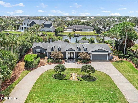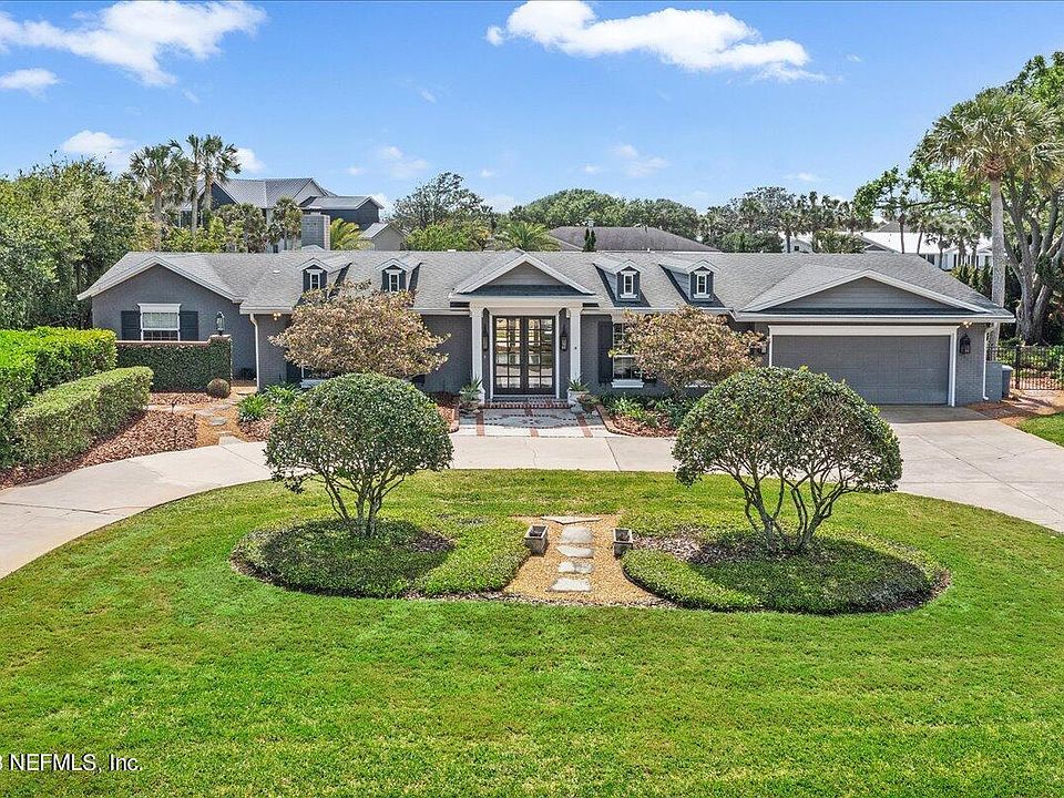 Experience coastal living at its finest in this fabulous one-story 3 bedroom home + office/den situated on a large, beautiful lot in Old Ponte Vedra. Just a short 0.3-mile walk from the beach access, you can enjoy the sand, surf, and sun anytime you please. The last renovation in 2011 included a sophisticated kitchen with black custom cabinetry and marble countertops and a separate bar with wine fridge and onyx countertops. The family room features a beamed ceiling and fireplace. Wood flooring flows throughout while the foyer features marble flooring. Solid doors, wide molding, and two laundry rooms.The circular drive provides convenience while the salt water pool, redone in 2017, and pergola offer a perfect backyard retreat.