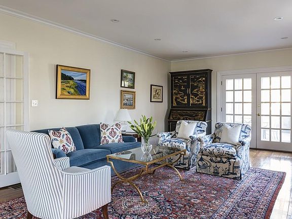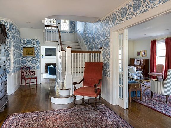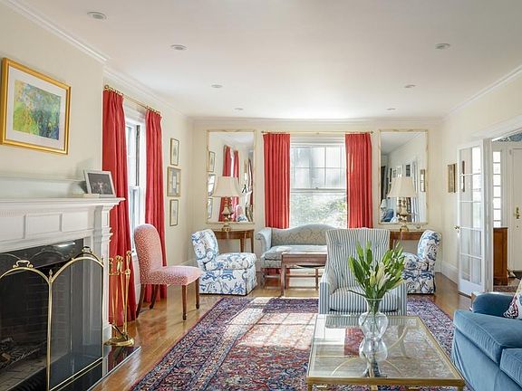Picturesque 1911 Colonial on one of Brookline's favorite tree-lined streets in historic Chestnut Hill neighborhood. Exceptional layout designed for entertaining and comfortable family living. Period details include 5 fireplaces, tall ceilings and original multi-paned windows. Gracious foyer flanked by oversized living room w/ fireplace and dining room w/ fireplace and built-ins. Sunny kitchen w/ built-in banquette opens directly to the family room w/ fireplace. Wrap-around porch for dining al-fresco and backyard access. 2nd floor consists of master suite w/ fireplace, walk-in closet, marble bathroom; 2 bedrooms, full bath, and window-lined office complete 2nd floor. 3rd floor offers 3 bedrooms and full bath. Renovated lower level includes play areas,1/2 bath, laundry. Playful 0.4 acre beautifully landscaped lot. Detached 2 car garage. Close to Heath, Brookline High and other top area schools. Ideal for commuters, quick drive to Boston, Longwood and Cambridge. MBTA 'D' line blocks away.