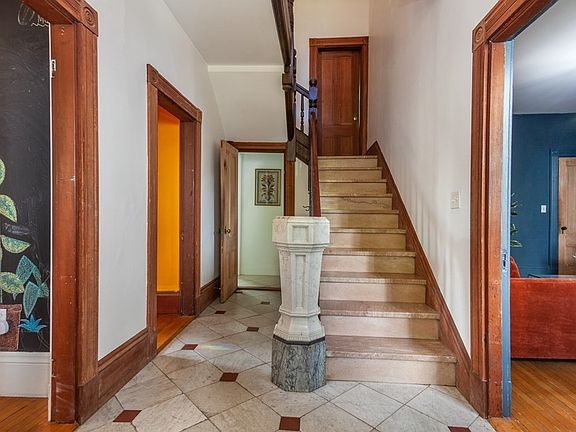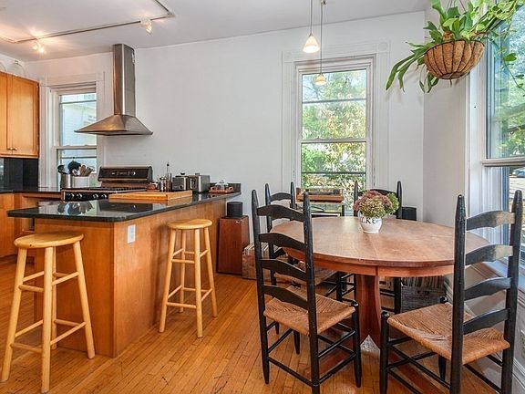 Regally situated on Somerville's coveted Spring Hill this unique townhome enjoys uninterrupted views of Boston's skyline and generous perennial gardens. Enter through the grand double doors and into the keeping room. Take off your boots, sort through the mail, and continue into the home to be greeted by a marble staircase and a foyer with soaring heights. This home has an impressive four bedrooms, the first of which you will find on the main floor. Use it as a home office, reconnect it with the spacious eat-in kitchen as it originally stood, or keep it as the primary bedroom. Built in 1875 the home is included on the Historical Preservation Commission and boasts character, solid-wood detailing and a fluid floor plan not commonly found. Enjoy your private patio off the kitchen and find your exclusive-use laundry and private storage space included as well. Furnace installed in 2011. Virtual tour available.