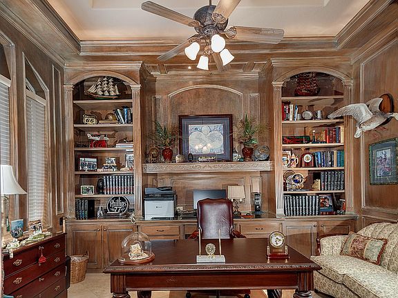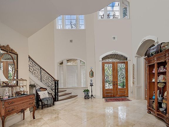 Exceptional custom home overlooking the Palmer Golf Course in Cochran's Crossing! Located on a quiet cul-de-sac, this former showcase home features a gated entry, three car garage, covered front porch, impressive 2 story foyer with intricate wrought iron staircase, a soft, neutral paint palette, and walls of windows providing serene golf course views throughout. The private study has French doors and gorgeous built-ins; the formal dining and living areas open to one another, with a coffered ceiling, cozy gas log fireplace, adjacent butler's pantry and wine room; the functional island kitchen with walk-in pantry, gas range with custom vent hood and dual ovens, warming drawer and an extended breakfast bar opens to the breakfast room and den; owner's retreat and 2nd bedroom suite down; two bedrooms and game room up with balcony; fenced backyard offers a covered patio, outdoor kitchen, heated pool and spa surrounded by pristine landscaping enhanced with lighting, and amazing fairway views!