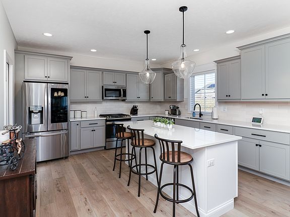 Exquisite home situated on a gorgeous lot that backs up to a berm with mature evergreens. This two-story home boasts four bedrooms and two and a half bathrooms. The kitchen showcases elegant grey cabinets complemented by white marbled quartz countertops and top-of-the-line stainless steel appliances. A spacious walk-in pantry adds convenience. Throughout the main level, you'll find wide plank laminate wood flooring and a custom-built mantel adorns the gas fireplace, enhancing the aesthetic appeal. Additionally, a versatile front flex room can serve as either an office or dining area...you can make it your own. The back hall features a convenient drop zone with a custom-built locker system. Right off the drop zone is the massive oversized 3 car garage. The 3rd bay of the garage measures 24 feet deep AND features a new 8 foot overhead door. The second floor boasts 4 bedrooms 2 full baths and a laundry room. The primary bedroom has a detailed ceiling feature, great natural light, a walk-in closet and an expansive primary bathroom with a dual sink vanity and custom tiled shower. The basement offers a rough-in for a future bathroom, with potential for the addition of a recreational room and bedroom to further enhance the living space. Please call for your appointment today!