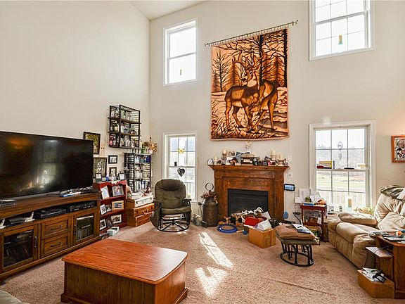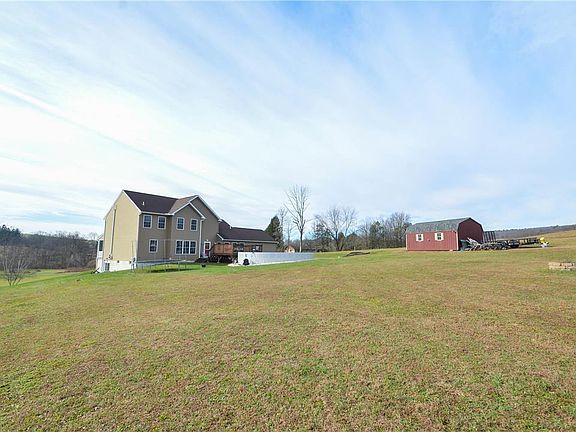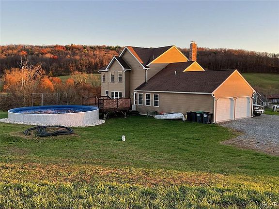 Panoramic views in this spacious Colonial nestled along the countryside of New Ringgold and situated on 2.75 picturesque acres abutting farm land. Inside, the sun filled main level boasts a living room with a Cathedral ceiling, a formal dining area, and open kitchen with antique wood stove, abundance of cabinet and counter space, along with extra seating at the breakfast bar! Additionally, there is a large first floor bedroom with 2 closets (one walk in), an attached full bath and access into a sunroom. Completing the main level is a powder room, laundry room and large pantry. Upstairs, there are 2 bedrooms, a loft, a bonus storage room or den, and a main full bathroom. Full finished basement is a great space to relax or entertain! Family room features a bar area, cozy wood stove and sliders to walk out to the yard. Outside, enjoy a 27' above ground with 8x10 deck, large 20x14 shed w/ plenty of room for 4wheelers, trailers, etc, & 2 car garage with unfinished bonus space above!