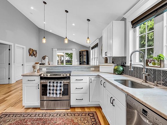 OFFER DEADLINE Monday 2pm! Welcome to this charming, fully renovated 3-bedroom, 2-full-bathroom ranch-style home, where modern comfort meets timeless appeal. Step inside to discover a spacious, open-concept living area that's been thoughtfully designed. The details throughout exude warmth & character. The living room features a cozy fireplace w/ wood-burning insert, perfect for chilly evenings! The heart of the home is the beautifully updated kitchen, where farmhouse style meets modern functionality. White cabinets, tile backsplash & SS appliances create a fresh, inviting space w/ a large dining area overlooking the back yard through the glass sliding door. Each of the 3 bedrooms offers a peaceful retreat. The master bedroom boasts an en suite bathroom, complete w/ a walk-in shower & modern finishes. Outside, the huge fenced-in yard offers a private oasis, perfect for pets & play. The beautiful stone patio, complete w/ an awning, provides the ideal spot for outdoor dining & relaxation.