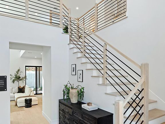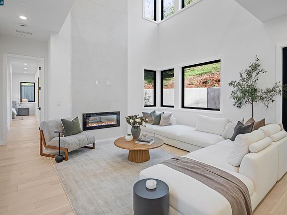Modern home at 18 The Nines in Lafayette, built by Thomas James Homes. This home offers 5 bedrooms and 5.5 bathrooms within 3,727 square feet of living space, and views of hillsides with beautiful mature trees. Enter the foyer under a soaring ceiling, steps away from the great room. The well-appointed kitchen (with top appliances throughout) features an expansive island, bar seating, and a walk-in pantry. The kitchen flows seamlessly, over engineered hardwood floors, into the dining area that easily seats 12, and then to a family room with an electric fireplace. A formal dining room sits adjacent, and a covered patio to the rear offers a venue for outdoor entertaining and al fresco dining. One bedroom with en suite bathroom is located on the main floor, while the other four, including the Grand Suite, are upstairs. Each upstairs bedroom has an en suite bathroom, spacious closet and is connected to a loft and laundry room. The home also offers a generous office space near the foyer, ideal for working from home. For recreation, Briones Regional Park hiking trails are just a quarter-mile away, and Lafayette’s top schools, restaurants, and shopping are all within easy reach.