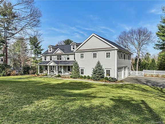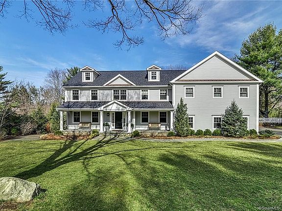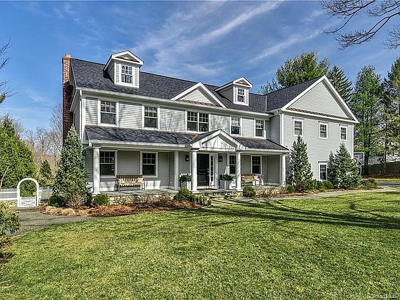 This is truly a home to fall in love with - A welcoming front porch invites you into this beautifully rebuilt colonial style home set on 1.01 acres on a cul-de-sac road within walking distance to the charming village of New Canaan, schools, YMCA and Waveny Park. Quality and character are signature trademarks throughout, from the gracious entry hall, designer chef's kitchen featuring furniture quality cabinetry, custom appliances, stunning countertops, large center island and spacious eating area, to the open family room that adjoins it. Formal living and dining rooms, and an oversized mud room complete the main level. The upper level boasts a spacious and luxurious master suite, plus three additional en-suite bedrooms and a study. The walk-out lower level offers a fifth bedroom, full bath, recreation room, plus bonus room and ample storage. An expansive rear deck overlooks the coveted acre of property, which has been professionally landscaped with mature English gardens and sprinkler and drip feed system. The backyard is fenced. Additional features include a 3 car garage, dog shower, and Generac 22KW generator. This classic house is a rare find. Room sizes and square footage are approximate.