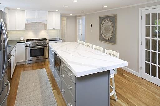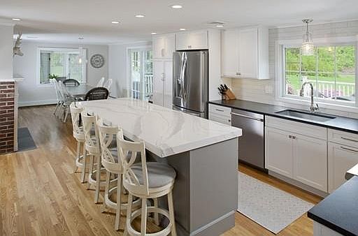 - Kit Dscrp: Window(s) - Picture, Main Level, Dining Area, Flooring - Hardwood, Cabinets - Upgraded, Deck - Exterior, Kitchen Island, Fireplace, Open Floor Plan, Recessed Lighting, Remodeled, Slider, Exterior Access, Wine Chiller, Gas Stove