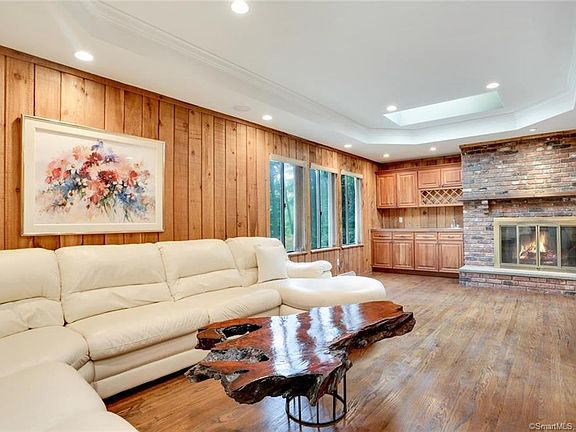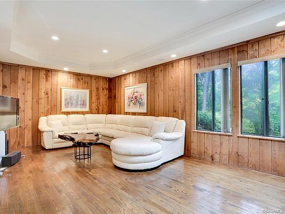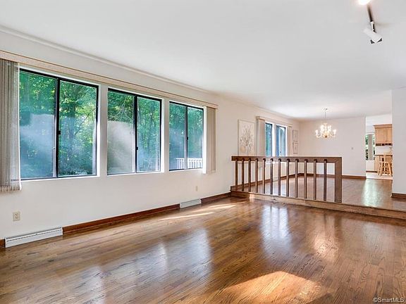 Expansive 2,691 sq. ft., 4 bedroom, 3.5 bath Contemporary located on cul-de-sac within short distance of Tashua Knolls Recreation Area with two golf courses, clubhouse, public pool, tennis courts, and playground. Hardwood floors in most rooms. Eat-in kitchen with skylight, island with Jenn Air electric cooktop, double wall ovens, stainless appliances, granite counters, ceiling fan, recessed lighting, and slider which accesses large rear deck overlooking private, level yard. Family room with built-ins, cedar plank on walls, trey ceiling, skylight, recessed lighting, wet bar, and gas-log brick fireplace. Dining room and living room with hardwood floors. Four bedrooms up, all with hardwood floors. Master bedroom offers walk-in closet, vaulted beamed ceiling, slider to private balcony, and full bath with skylight, separate tub/shower, and updated vanity. Finished, walkout, lower level with wall to wall carpet, 2 sets of sliders to level rear yard, full bath, garage access, and plenty of storage. Three car attached garage. Zoned gas heat. Central air. Irrigation system. Convenient location. Award winning school system.