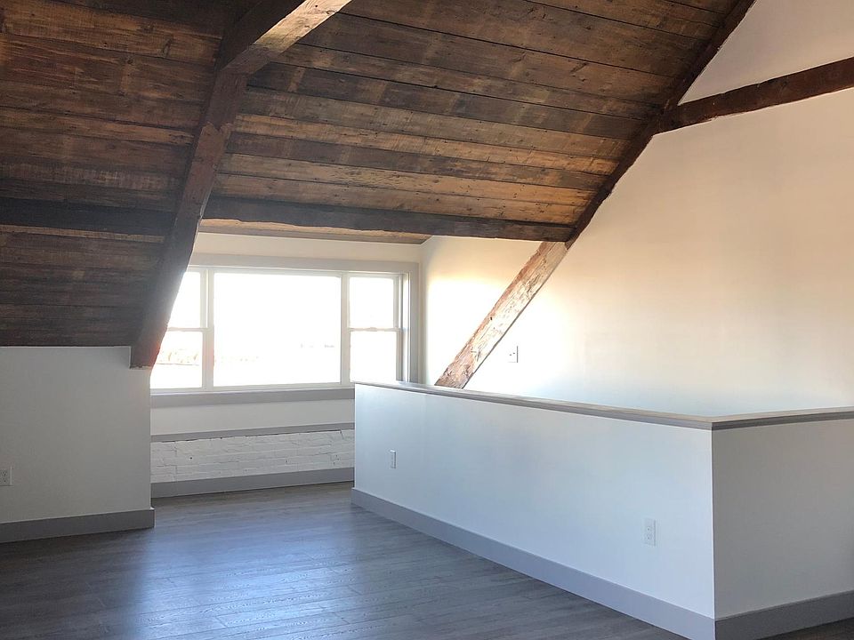 Two floor loft style one-bedroom, one bath apartment on the second and third floors of a historic captain's house in Rockland. Conveniently located one block from Main Street. Enjoy the reclaimed barn-board cathedral ceilings and exposed brick in the bedroom with views of Rockland Harbor. Newly renovated and restored, this unit offers a large kitchen. $1250/month includes electric, heat, water & sewer, trash and one off street parking spot.