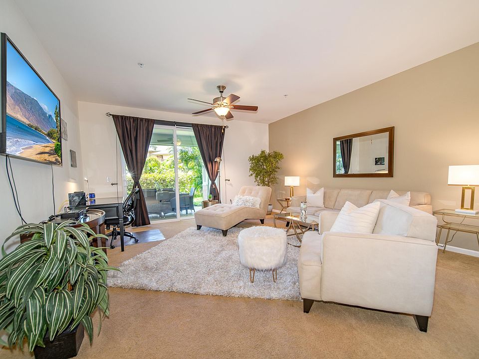 Luxurious, Unique Shangri-la: Fall asleep to the near distant lullaby of the ocean's surf. Ground floor unit is being sold FULLY FURNISHED & TURN-KEY! Electrolux HE stack Washer/Dryer, Central AC, NEWER SMART 75" HD Flat Screen LR TV + wall mounted flat screen TVs in both BRs with newer Amazon Firesticks. Shower & tub in BOTH Bathrooms, Upscale Pier One Primary BR furnishings w/ Cal. King Bed, Custom Built-In Primary BR closet system. NEWER Casper Queen mattress in 2nd BR, Tiled & carpeted flooring. 2 walls have backsplash upgrades. Resort-like furnished patio offers a private, landscaped yard area, Upgraded custom lighting! One open parking, several guest stalls & One Car Enclosed Garage! BOTH Elevator & stairs access, evening security patrol. Close to shopping, dining incl. Dolphin Plaza, Rainbow Mall, Kama'ole Shopping Center, community parks & beautiful white sand Kihei Beaches & sunsets! Est. 30 mins. from hospital. Building E is the last to be completed in KAOV. 24 hr showing notice may be possible. Pet friendly!