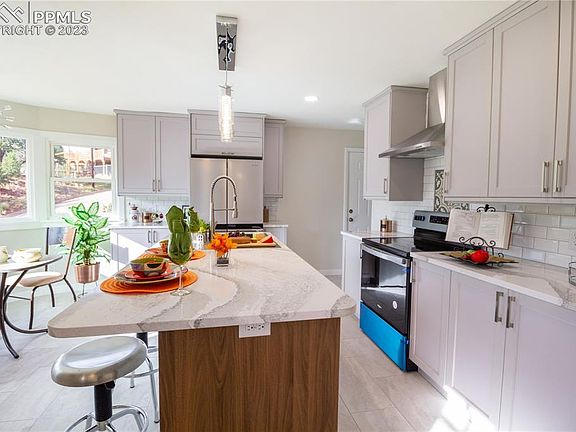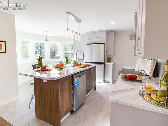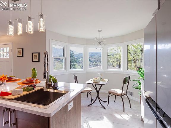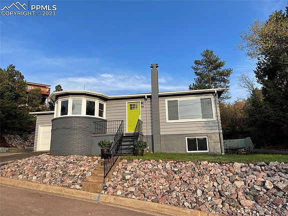 This 1950’s raised ranch style home is a must see! Located in Garden of the Gods Village - the most desired subdivision in Manitou Springs. Your new home is just minutes away from the heart of Manitou - about a 5-minute jaunt to the Manitou Penny Arcade, Memorial Park, Manitou Hot Springs, Shoshone Springs Historic Artesian Mineral Springs, and much more! It has been fully remodeled in keeping with the 1950’s mid-century modern theme. Home includes all new windows, all new electrical, all new plumbing, new furnace, new hot water heater, added A/C and more! Cosmetic upgrades include: all new tile, all new paint inside-and-out, and fully refinished original solid oak hardwood floors throughout the main level. Kitchen features all new Corian countertops, huge island, all new cabinets with plenty of storage, beautiful backsplash and all new stainless-steel appliances. Magnificent views of Pikes Peak and foothills from the dining room bump-out bay windows! Spacious main bathroom with double vanity sink, tin ceilings, and all-new beautiful vintage-style tile! Basement is fully finished with new carpet, new wood burning stove, fully remodeled bathroom with defogger and color-changing vanity mirror. Utility/laundry/mudroom with finished epoxy floors, built-in ironing board and counter for folding laundry. This home has plenty of storage, with an entire room for a pantry and/or dry storage, several linen/coat closets and more! Property is on a .33-acre lot and don’t miss the 360 degree views of the city and mountains from the top of the massive red rock in the backyard! This 1950’s modern home will go fast!