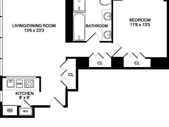 Ready for occupancy. At over 720 square feet with a full kitchen, apartment 14C is one of the largest one-bedroom units in the building. This corner apartment features floor-to-ceiling glass walls, hardwood floors, high-end kitchen appliances, stainless steel countertops, multiple closets, and a spacious bedroom with his-and-her sinks, an oversized tub, and a separate shower. A washer and dryer are also included in the unit.