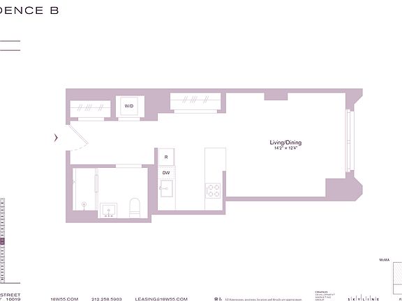 Apartment 14B is an elegant, streamlined studio residence offering a thoughtfully designed living space. Features include a gracious entrance foyer, 9-foot ceilings, and oversized windows with views onto 55th Street that fill the home with natural light. The sleek, modern kitchen is equipped with custom Italian cabinetry and Cambria quartz countertops. A premium Bosch appliance suite includes a gas cooktop (a rare feature in new construction) with a microwave above and oven below, while the refrigerator and dishwasher are seamlessly integrated into the millwork for a clean, modern finish. The spacious bathroom features marble floors, a custom vanity with Cambria quartz countertop, satin nickel fixtures, and an illuminated mirror. Additional highlights include an in-home washer/dryer, a large walk-in closet plus coat closet, and 5" wide-plank white oak engineered flooring that flows throughout the home. 18W55 is a boutique collection of exquisitely crafted rental residences along Manhattan's iconic Fifth Avenue. This ground-up luxury development designed by Morris Adjmi Architects offers studio, one, two and three-bedroom homes as well as full-floor penthouses, blending timeless materials with modern aesthetic in a setting that reflects the elegance of its surroundings. Gracious interiors feature oversized windows, nine-foot ceilings, engineered white oak flooring, and spa-inspired baths finished with Italian marble and custom oak vanities. Elevated amenities span over 10,000 square feet, including FRAME, a two-story fitness center; THE FAIRWAY, a golf and entertainment suite; THE SCENE, a screening and performance space; THE EXCHANGE a two-story business center; and THE PARLOR, a resident social lounge where fresh coffee and light breakfast will be provided. Additional offerings include THE PAW WASH, a pet spa; THE VAULT, a secure storage area for residents; 24-hour attended lobby, doorman, and on-site concierge by LIVunLtd. Just moments from Central Park and the city's finest culture, shopping, and dining, 18W55 is Fifth Avenue living, redefined. Price shown is Base Rent. Residents are required to pay Application Fee ($20.00, Non-refundable, One-Time, At Application, Per Leaseholder); Security Deposit (Refundable, One-Time, At Move-in, Per Apartment); Utility Electric (Third-Party Usage-Based, Non-refundable, Per Month, Per Apartment); Renter's Liability Insurance (Third-Party Variable, Non-refundable, Per Month, Per Apartment). Please contact a leasing representative for a full list of all optional and situational fees.