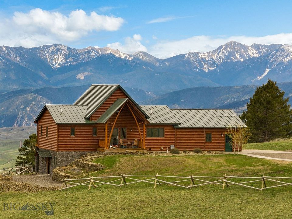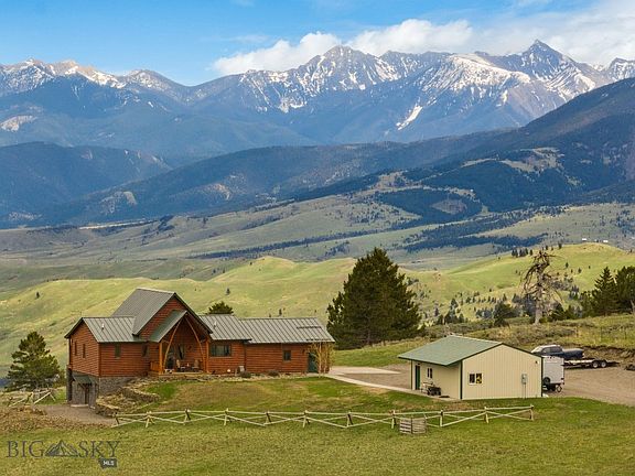 Spectacular custom home on 20 acres perched at the top of Quinn Creek with 360º views. Mountain ranges are visible from all angles - crystal clear views of the Bridger Range, the Yellowstone corridor and Tobacco Root Mountains - on a clear day you can see nearly 50 miles east. Inside, this custom finished log home offers 2 bedrooms, loft space and sleeping room for up to 13 spread over 2,676sf. Meticulously crafted with hand-hewn floors, custom stonework on the interior and exterior and rare cedar accent beams & bannisters to go with a chef's kitchen, super fast internet connection, plenty of space for guests and rolling meadows to explore, this property is a vision of the Montana dream. Easy, year-round access from I-90 and only 20 minutes to downtown Bozeman, there's a sense of being away from it all from your mountaintop splendor while still oh-so-close to the bustle of the city. The property also includes a large 24x32 detached shop (with heat & power) to go with the two car garage and multiple storage rooms throughout the house. A fully functional Montana mountain luxury property with views you'll find nowhere else.