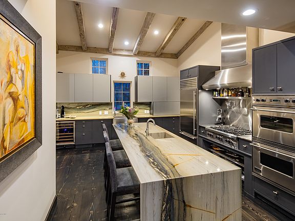 Set on a quiet street just outside of downtown Aspen, this newly remodeled Knollwood residence lends a modern twist to classic European Alpine design. A thoughtful floor plan contains the living, kitchen and dining areas, all opening to the expansive outdoor terrace with a large wood burning fireplace, protected by mature trees and heated to enjoy year-round. Filled with natural light, the great room's multiple seating areas are perfect for entertaining. Be welcomed into the luxurious main-level master suite through a marvelous office and library. Fresh, modern finishes are layered with traditional design elements to create a warm, elegant ambiance. The lower level includes a media and lounge, ample wine storage and a guest master suite.