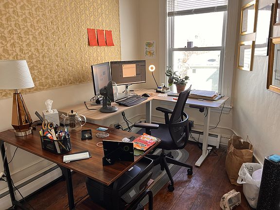 6. Flexible layout: There's one primary bedroom towards the back of the apartment, and a second smaller bedroom that is currently used as an office (so total, 2br). The living room can be converted into a large bedroom (to be a 3rd bedroom, or make that the 2nd if you want to make the smaller room an office) if you don't need a separate living room and dining room. There's a large closet in the hallway attached to the living room that we currently use as storage.