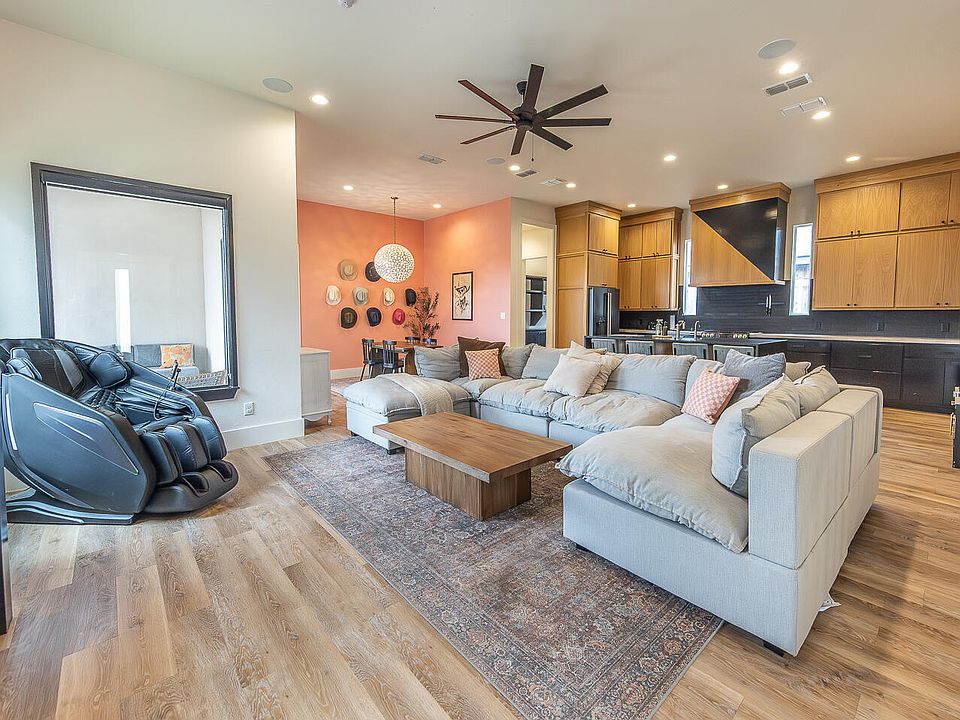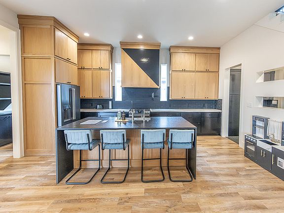 Step inside and you'll find soaring ceilings, an open-concept layout, and designer finishes throughout. The spacious living room flows seamlessly into a chef-inspired kitchen featuring sleek cabinetry, a striking vent hood, a large island with seating, and premium appliances. Natural light pours in through thoughtfully placed windows, creating a warm and inviting atmosphere.