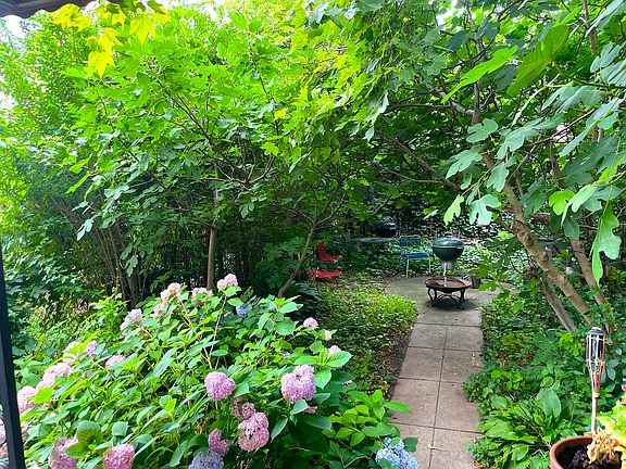 Spacious 3 bedroom 2 bath parlor floor thru with open floor plan & high ceilings on a quiet residential block. A large landscaped private garden with mature trees and a covered patio, washer dryer, dishwasher, close to express D train and industrial city. Unique 25 ft wide townhouse with approximately 1,150 sq ft of living space. Available aug 15 to sept 1.