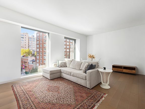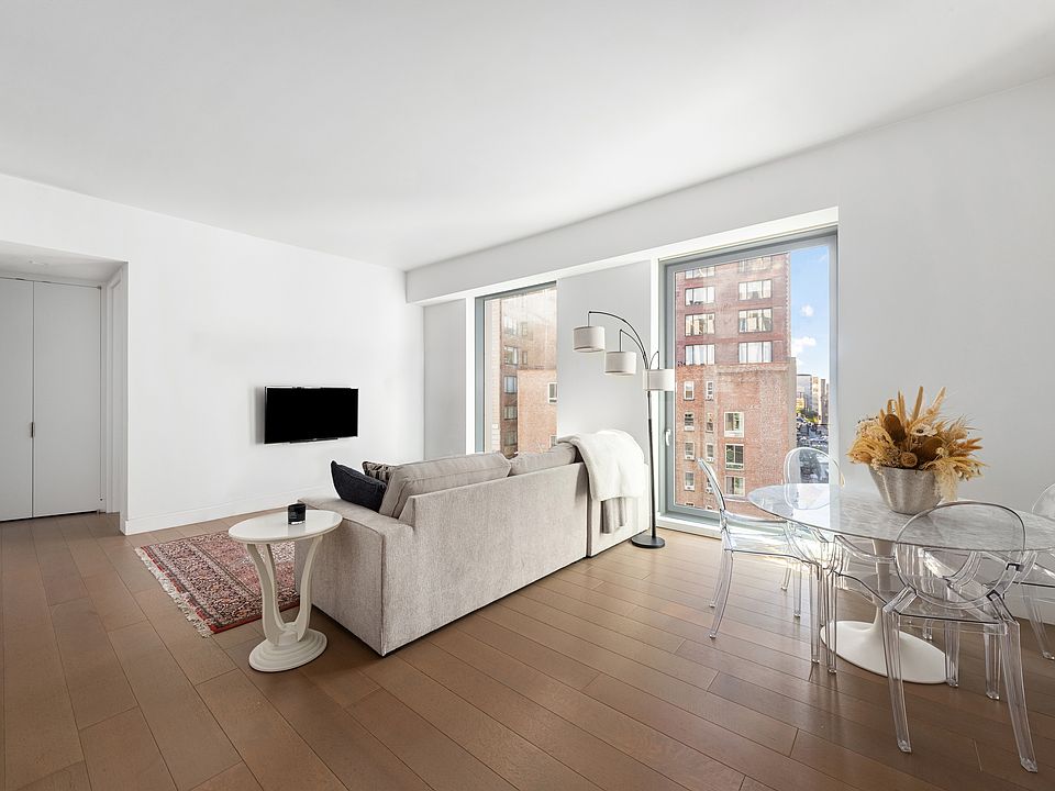 Residence 5C at One Vandam is a one-bedroom, one-bathroom apartment spanning 836 square feet in the vibrant SoHo neighborhood. As you enter, the home's highlight is its spacious living and dining area, which is lit by large, floor-to-ceiling West facing windows. These windows offer picturesque views of classic New York City brownstones and the skyline. The open layout and white oak floors create a seamless, elegant space perfect for both relaxing and entertaining guests.