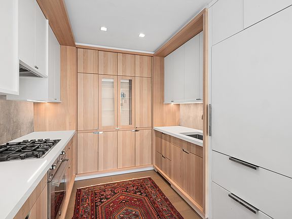 The kitchen is a key feature of the apartment, designed with a clean, modern aesthetic. It includes custom walnut and lacquer cabinets and is equipped with high-end appliances, such as a Bertazzoni cooktop, Liebherr refrigerator, and a dishwasher. The bedroom offers a peaceful retreat with an attached walk-in closet, while the newly renovated bathroom provides a touch of luxury with marble floors and a custom vanity. The unit also includes modern conveniences like an in-unit washer / dryer, central air conditioning, and automated shades for easy living.