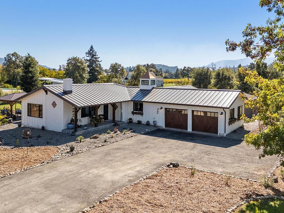 This elevated Wine Country retreat in the heart of Kenwood has been beautifully reimagined with exceptional craftsmanship and refined design. 360 degree VIEWS of Mountains and Hills are the backdrop for this special property. Set on just under 2.5 level acres, the single-level 2,017 sq. ft. home features 2 bedrooms, 2.5 baths, and a versatile flex space with office, pantry, laundry, and a custom dog-washing station. (Could be 3rd Bedroom) The formal living and dining room showcase vaulted ceilings, Valor GE4 Electric Fireplace and abundant natural light, while the open-concept family and kitchen retreat highlights custom cabinetry, Ijun Blue Quartzite surfaces, and top-tier appliances including Sub-Zero, Wolf, and Miele. Artistic touches abound from the handcrafted stained glass Blue Heron by a Sonoma artist to a Copper Weathervane Crowning the Cupola. Every detail has been thoughtfully curated, from designer lighting and automated shades to Hardie fire-resistant siding, metal roofing, and solar with battery backup. Surrounded by graceful olive trees, metal fencing, and beautifully designed landscaping, this is elevated Wine Country living at its finest. Room for a pool AND a large barn with ADU and expansion possibilities.
