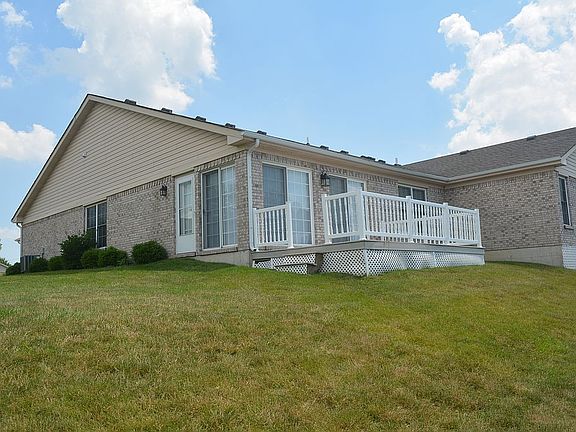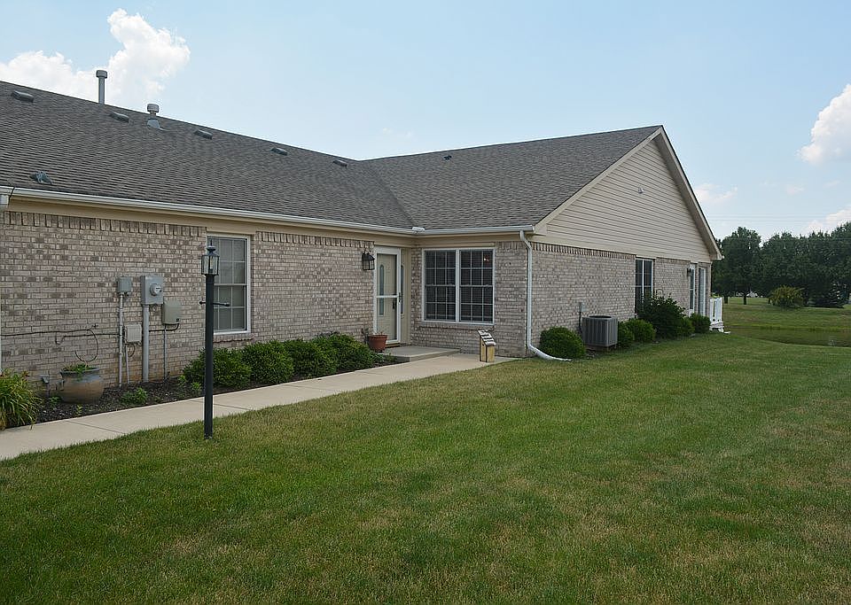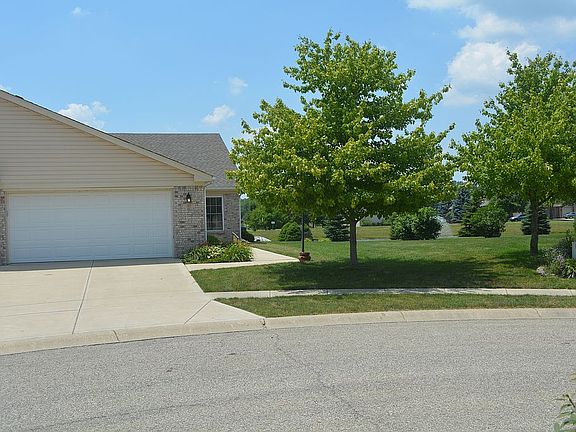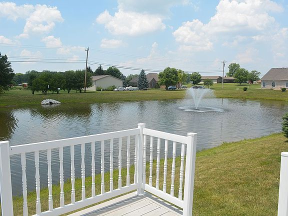 You must see this spacious, open concept, high ceilings, 2 bdrm, 2 bath, custom brick, attached home with maintenance free deck, over looking serene pond and fountain!! Sell the mower and snow shovels, because mowing & snow removal are taken care of for you in this friendly quiet community!! Kitchen appliances stay! Relax & enjoy the enclosed sun room with custom shades over looking the pond. Hard surface flooring in main areas, handicap accessible shower. Finished two car garage, with shelving.