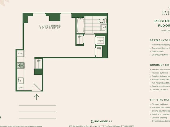 Brand-new to the market, residence #1507 is a spacious studio with floor-to-ceiling windows and abundant storage space with three closets, including a linen closet. Perched tall in vibrant and historic Fort Greene, The Everly features two floors of expansive, exclusive amenities. In the 2nd Floor Clubhouse: -State-of-the-art Fitness Center -Flow Studio -Ski Simulator Lodge -The Range Multisport Similator -The Workshop -Children's Nook -Content Studio -Fireside Lounge -Game Den with Billiards, Ping-Pong, & Shuffleboard -Great Lawn with Move Screen -Terrace with BBQ Grills -Dog Run Up on the 50th Floor Sky Lounge: -Outdoor Pool Deck with Hot Tub -Serenity Suite & Steam Room -The Reserve -- Wine & Party Room -Workspace Garden -Game Loft with Bocce & Foosball -The Overlook Lounge with sprawling Manhattan and Brooklyn views All homes include: -Modern oak wood flooring -Bertazzoni stainless steel appliances -In-home washer & dryer -Quartz countertops and backsplash -Grohe fixtures -Solar shades -USB/USBC outlets Spa-like bathrooms with: -Porcelain tile flooring -Light-up vanity mirrors -Grohe fixtures -Medicine cabinet -Quartz vanity with custom shelving At The Everly, you are rooted in Fort Greene yet moments away from the best of what Brooklyn has to offer and a just subway ride from Manhattan with Fulton St, DeKalb Ave, Nevins St, and Lafayette St stations all in immediate proximity. 1 1/2 Month free on a 16 Month Lease. Gross rent is $3,525, net effective rent is $3,195. $1000 security deposit for qualified applicants. FOR A LIMITED TIME: One year of complimentary WiFi through Astound. DISCLAIMER: Rockrose Development L.L.C. is the exclusive broker/agent for the landlord (Landlords Agent) for this property. Prospective renters, their brokers and/or agents understand that neither the landlord nor Landlords Agent will charge or collect fees to a prospective renter in connection with this property except for administrative and/or application fees as permitted by law. Nor will landlord or Landlords Agent assume responsibility for any brokerage fees incurred by a prospective renter in connection with this property. Any broker/agent who contacts management in connection with this listing, who is not the exclusive broker or who does not have a Landlord Broker Agreement, is not the landlords broker/agent and will not be paid by landlord. Brokers shall not publish or otherwise advertise any listing without the express written consent of the landlord. This listing is being advertised to prospective renters. FEE DISCLOSURE: Please be further advised that tenants may incur fees and charges in connection with the rental of Landlords properties pursuant to the terms of the lease agreement, including, but not limited to, application fee, amenities fee, parking late fees, pet fees, insufficient funds, window guards, key replacement, and third-party utilities.