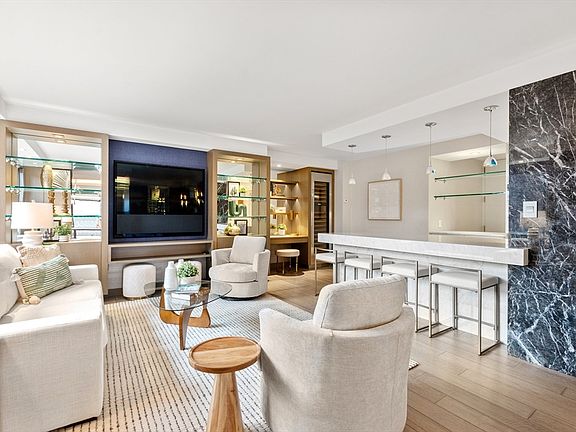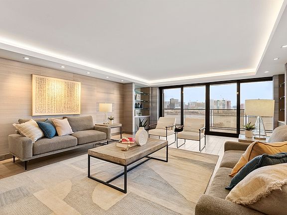 Completely renovated in 2022 with the utmost attention to chic design, this elegant unit offers sweeping views of the Charles River and city skylines, plus custom millwork throughout. Through the foyer, the 42' living room opens to the private 19' riverfront balcony through sliding glass doors. The 24' dining room provides a marble wet bar. The smartly designed chef's kitchen showcases marble countertops, a peninsula for bar seating, SubZero refrigerator & wine cooler, gas Wolf range, and door to the hallway for laundry room access. The adjacent family room also has chic built-ins. A sprawling primary suite offers river views and double closets, plus a sleek marble bath with a walk-in shower and radiant heat. The second bedroom is fully outfitted with cabinetry and a built-in desk, plus a marble hall bathroom with a soaking tub and radiant heat. Other features include a powder room and 5-zones of heating & cooling. Onsite professional management with a 24/7 concierge, gym & clubroom.