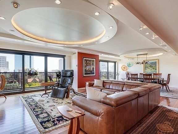 AMAZING renovated & spaciously open Upper Floor 3+ bed combo unit at this luxury full-service bldg & premier Back Bay location. Spanning the sunny Beacon side of the 17th floor, you will enjoy 180° VIEWS, from the charming Beacon Hill/Boat Basin sunrises to the spectacular Charles River sunsets over the sailboats. The stunning LR&DR spaces feature Brazilian cherry floors, auto shades, circular tray ceilings w/custom lighting, surround sound & walls of glass leading to 2 Private Balconies. The magnificent chef’s kitchen provides plentiful custom Premier cabinets w/unique blend of quartz & imported glass counters together with a luxury suite of appliances, including SubZero frig, Miele d/w, commercial grade vented Wolf stove, wet bar & wine frig. Pocket doors create private guest bdrm suite. All 3 baths feature marble finishes. 17AB has RARE IN-UNIT LNDRY RM, 2 Storage Areas + 2 Valet Parking Spaces. Building amenities incl 24-hr concierge, professional on-site mgmt & fitness room.