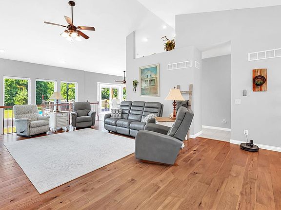 This home has it all from curb appeal to elevation, There are so many things the home has to offer Outside: Outbuilding w/loft, replaced deck w/25 year protected coating, cover over deck, ceiling fan, fire pit, above ground swimming pool, hot tub, Roof, 6" gutters & downspouts, gutter guards, septic clean out, closed in garden, trees around property, professional landscaping, Lets step inside: Split bedroom floor plan offer wood scrapped floors, great room, dining, hallway and primary bedroom, Luxury vinyl in 2nd & 3rd bedrooms, updated hall bath with step in shower, Shiplap hearth with upgraded gas fireplace insert w/ blower, The kitchen has all updated appliances with double oven, bottom freezer Frig, Quartz counter tops in the kitchen, refaced cabinets with underlighting. Main floor laundry, utility sink and built in cabinets, Main bedroom with double sinks, jetted tub and separate shower, refaced cabinets, mechanical blinds on atrium. LL rough in for full bath and family room