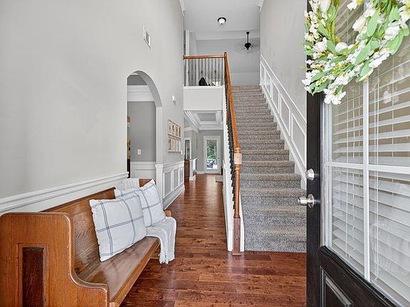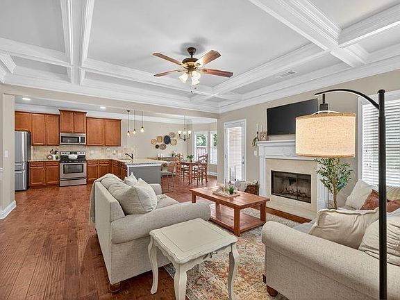 *BACK ON THE MARKET DUE TO BUYER HEALTH ISSUES* Welcome to this stunning 4-bedroom, 3-bathroom home nestled in a highly sought-after community, where charm and elegance meet thoughtful design. From the inviting rocking chair front porch to the beautifully crafted interior details, this home is truly a standout. Step inside to discover a spacious and light-filled floor plan featuring gleaming hardwood flooring flowing into the spacious formal dining room with coffered ceilings and views into the gourmet kitchen! The gourmet kitchen is a chef’s dream, boasting stainless steel appliances, granite countertops, abundant cabinet space, and an expansive layout perfect for cooking and entertaining in the grand family room in this open concept layout! Enjoy your morning coffee in the eat-in kitchen by the beautiful bay window with private picturesque views of the backyard! Down the hall, you will find a spacious bedroom and full bathroom on the main level. Head upstairs an oversized loft with soaring vaulted ceilings and exquisite trim work throughout. Down the hall you will find that the grand primary suite is a true retreat, complete with double crown molding, a beautifully detailed ceiling, and a cozy sitting area. The luxurious en-suite bathroom features granite countertops, double vanity sinks, a separate glass-enclosed shower, and a relaxing soaking garden tub, plus a massive walk-in closet for all your storage needs. Two additional spacious secondary bedrooms with vaulted ceilings offer excellent closet space and share a well-appointed full bath. The convenient upstairs laundry room adds ease to everyday living. Back downstairs, step outside to your private, fenced-in backyard oasis with an extended covered patio—perfect for entertaining, grilling, or simply relaxing. This home blends style, space, and comfort in a location that can’t be beat.
