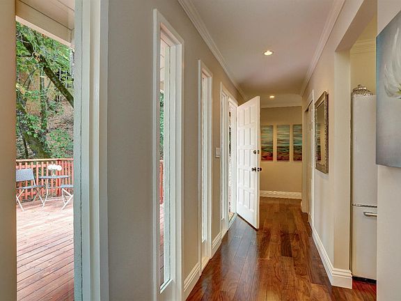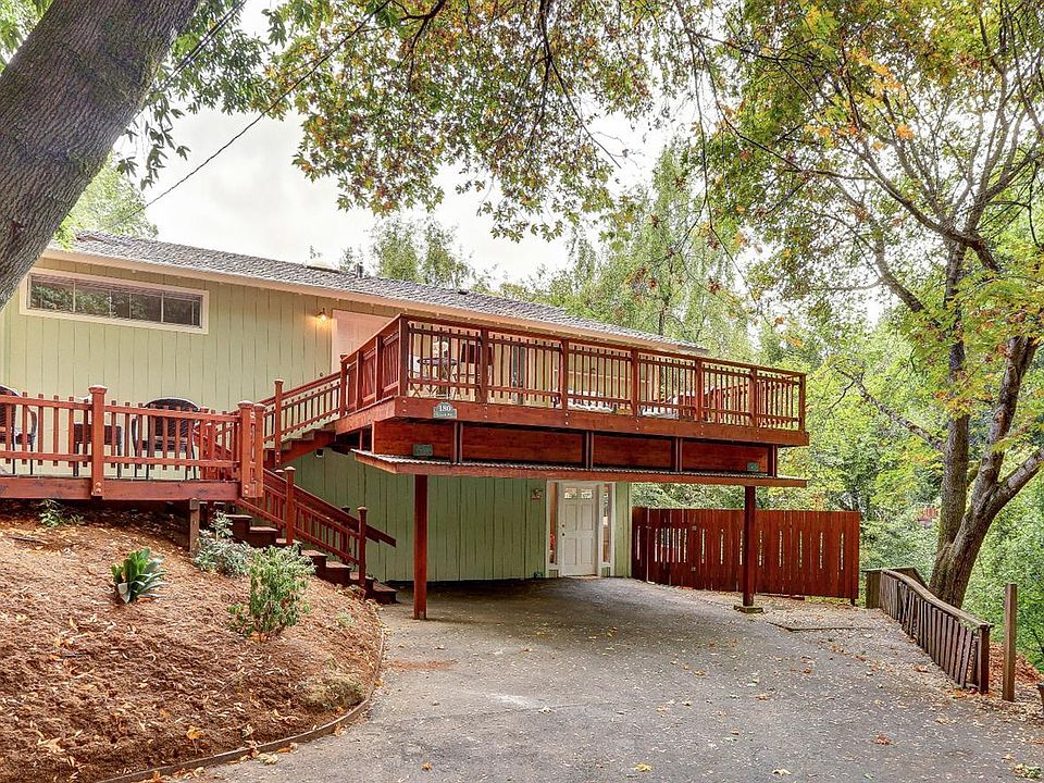 Chic hideaway @ San Anselmo/Ffx border a stylish dramatic retreat 2 levels w/a flr plan that works for many lifestyles main level has mstr bdrm w cathedral ceilings a 2nd bdrm retro ktchn ample dining area & quaint living room leads to balcony,Spiral staircase to 2nd level be surprised by a lrg family-media room attached to a 3rd bd/office & 2nd bath w/exterior access great cul-de-sac location thoughtfully updated so you can enjoy nature in style