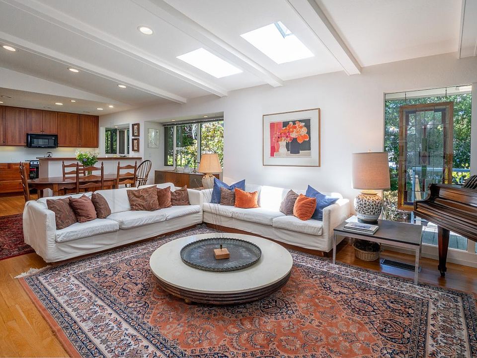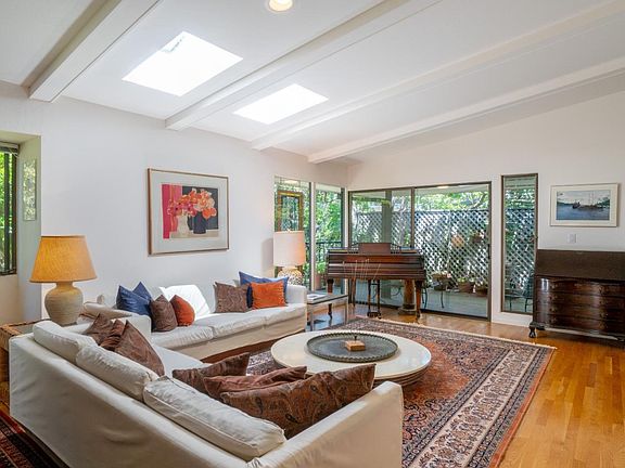 Nestled in a private oasis of redwoods and lush greenery, this beautifully appointed and remodeled "B" model end unit is special in every way. Wonderful light, bright and cheerful with 5 skylights! Beautiful hardwood floors. The gorgeous gourmet kitchen with custom cabinetry, top of the line appliances, corian countertops and a stunning garden view is not only handsome but also functional and is open to the living/dining area for entertainment. A fantastic den/study or artist nook with window looking out to the sunny private back deck is a delight to behold. Each bedroom is spacious, private and delightful. The remodeled Master bath has shower and tub and the guest bath has a walk-in shower with built in seat. The inside laundry is full size too! The "creme de la creme" in addition to the private deck is two secluded and intimate patios. One is at the entry abundant with fragrant and blooming roses. Off of the deck in the back are shrubs, ferns and redwoods. Don't miss this private sanctuary! Del Mesa is an active adult retirement community with gourmet restaurant, pool, spa, gym, library, lawn bowling, putting green, arts and crafts studio, organic gardening, workshop, dog park, acres of strolling paths, 24/7 guard gated security, activities and much more.
