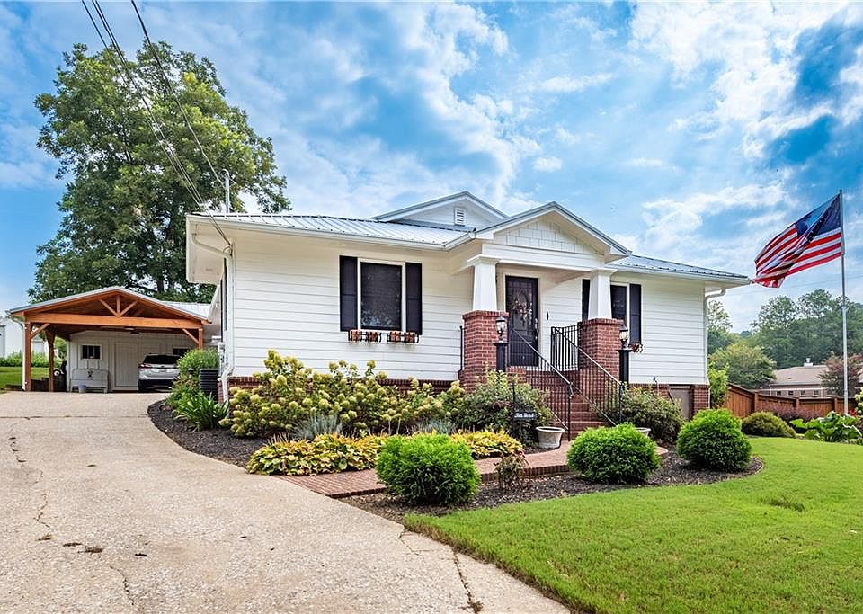Custom remodeled 2BR / 2BA Ranch with a bonus/flex room in downtown Ball Ground just 2 blocks from main street. Open concept floor plan featuring hardwood floors, accent shiplap wall in the living room and brick accent in the kitchen. The newly designed kitchen features white cabinets, solid surface countertops, farm sink, stainless appliances, mini beverage refrigerator, island w/cooktop, and walk-in pantry. Large bedrooms and a home office that can easily be converted to 3rd bedroom. Outdoor living at its finest with a covered deck, spacious patio, custom salt water pool, and privacy fencing. Expertly landscaped corner lot at .39 acre across from the BG post office. Additional features include metal roof w/solar panels, tankless water heater, and multiple storage/workshop buildings.