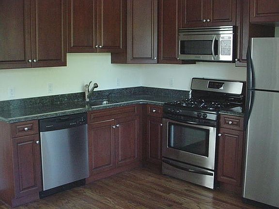 Built 10 years ago, this 2 bedroom 1 bath flat features; marble bath, cherry kitchen cabinets with stainless steel appliances, granite counters, hardwood floors, laundry in unit, 2 garage parking spaces and across from express bus to NYC. 1 month broker fee and $250 moving fee